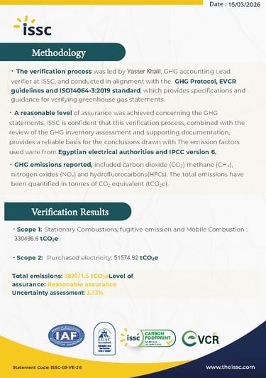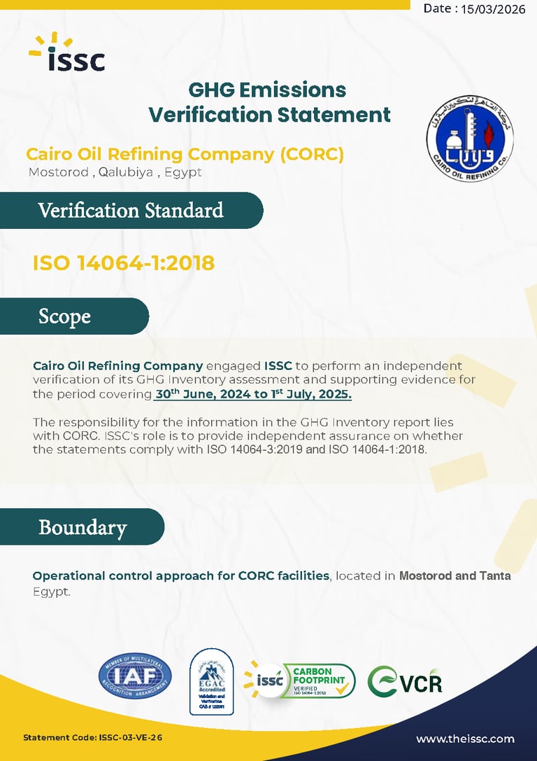 ISO 14064-1:2018 Verification for greenhouse gas emissions report "Organization level" for Cairo Oil Refining Company "Mostorod &Tanta refineries"