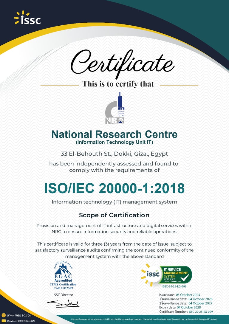 Awarded to the National Research Centre (NRC) – Information Technology Unit (IT)